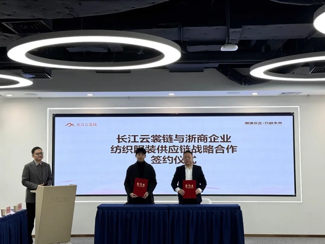 活动现场举行了纺织服装供应链战略合作签约仪式。武汉长江云裳供应链有限公司与绍兴倚信纺织品等3家浙商企业达成合作,聚焦面辅料集采交易、数字化印染解决方案、智慧仓储物流三大关键环节,深化两地产业链上下游整合,标志着与浙商产业协作进一步深化。